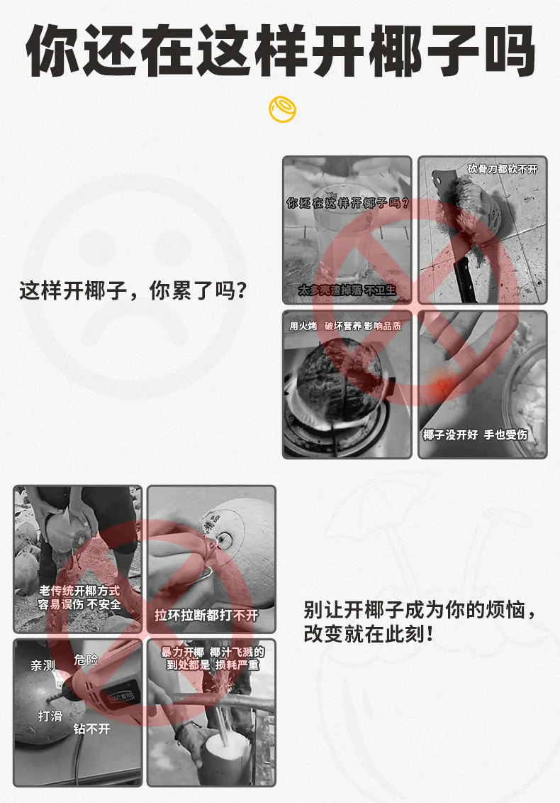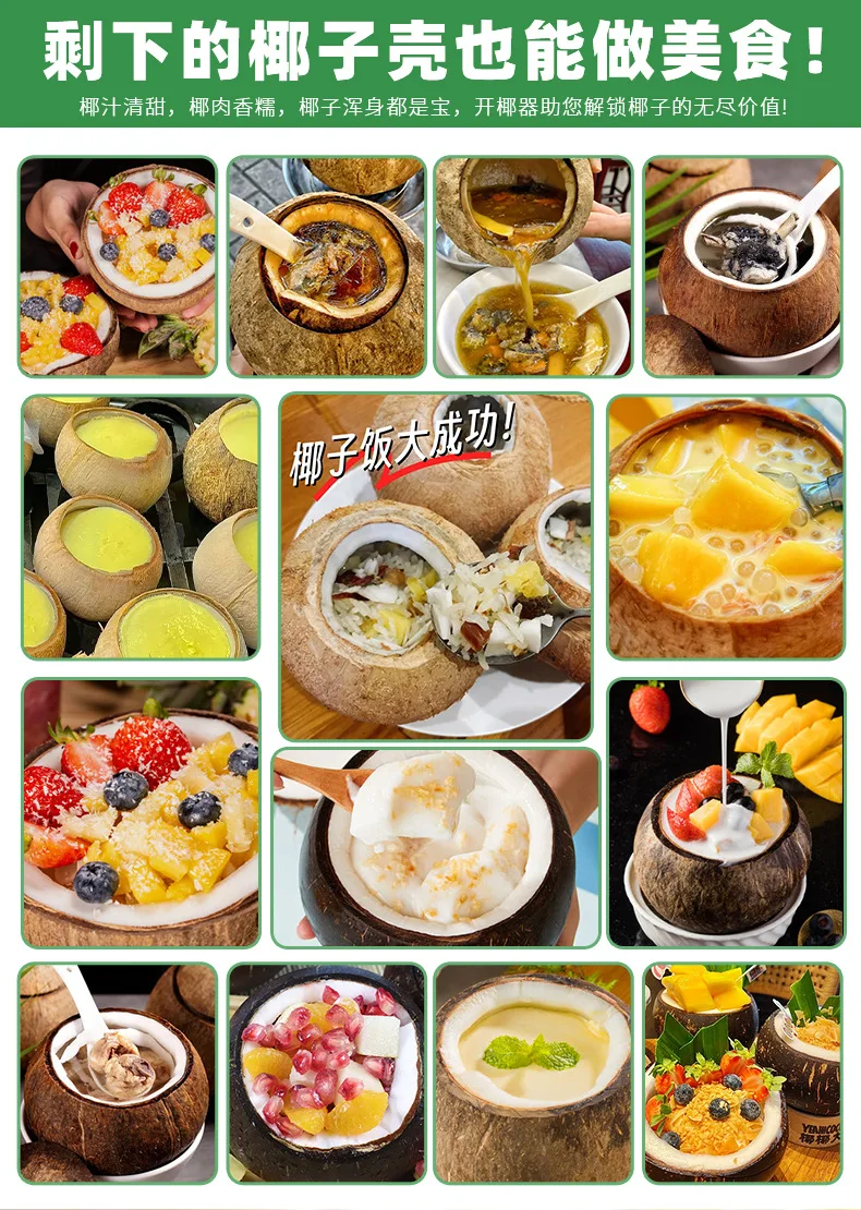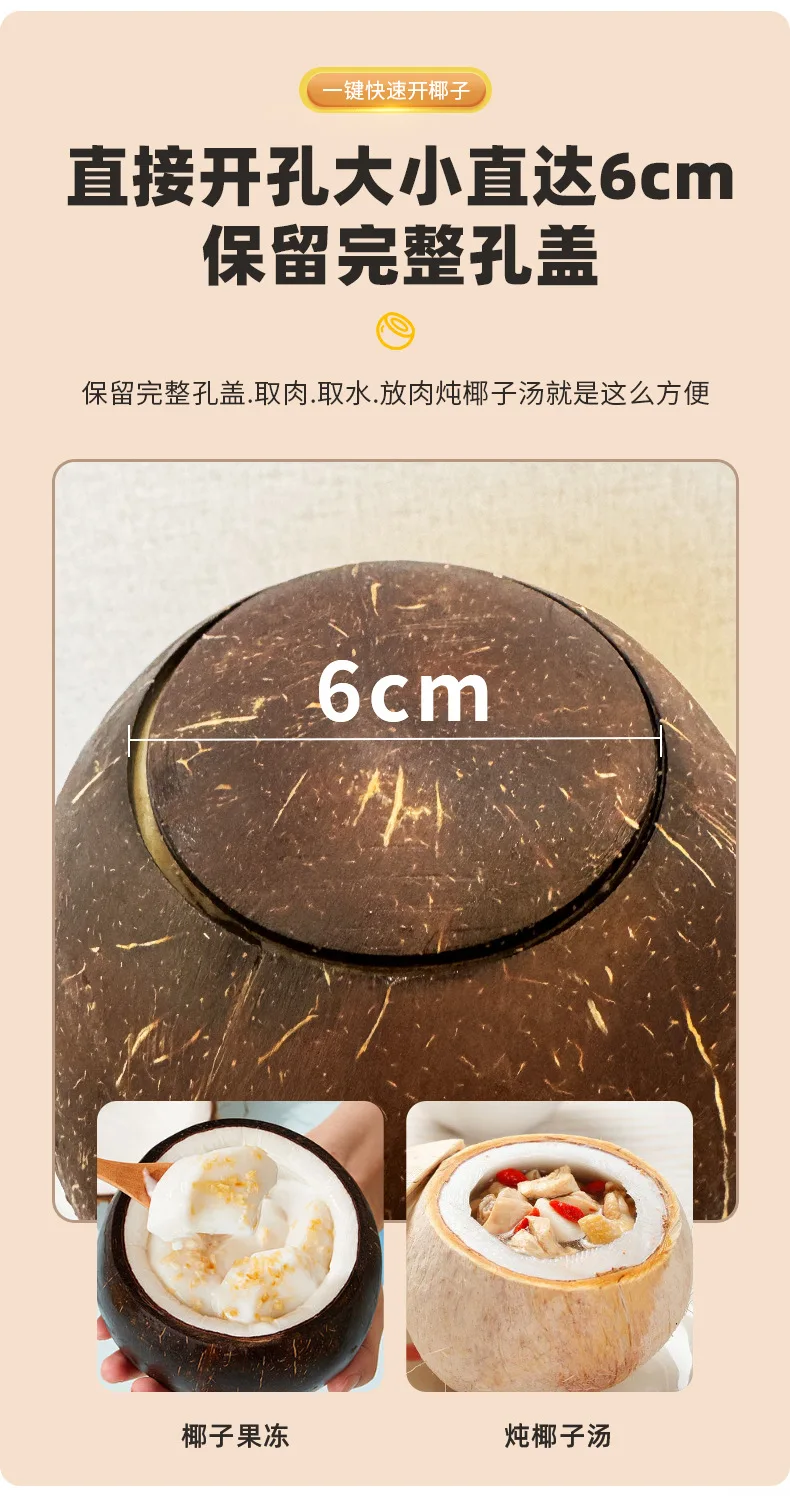 If the coconut you purchased comes with three small holes, you can also use chopsticks to poke it open first, pour out the coconut juice (if the green coconut skin is too thick, it is recommended to peel it off), and then use a coconut opener to open the coconut more quickly according to the above operation method. When the coconut remover cannot be turned, it means that the coconut meat has been opened. After cleaning the surface, use a small knife with a coconut meat scraper to pry open the coconut and easily leave the coconut shell intact to take the coconut meat.