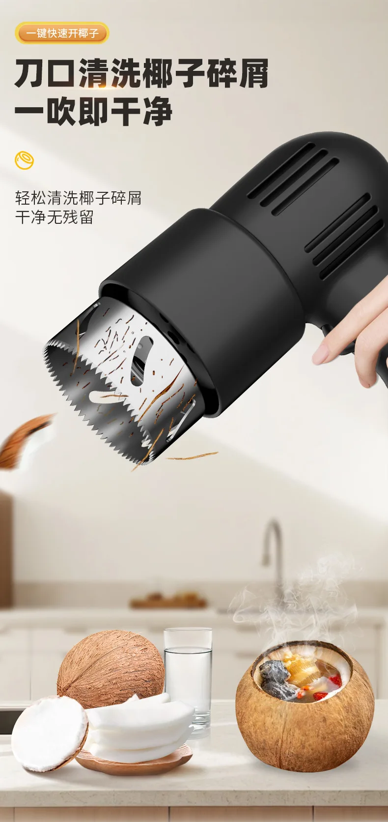 ② Put the coconut blade into the water and press the start button to clean it. Special attention: Water should not enter the motor, otherwise it may cause a short circuit and burn out
