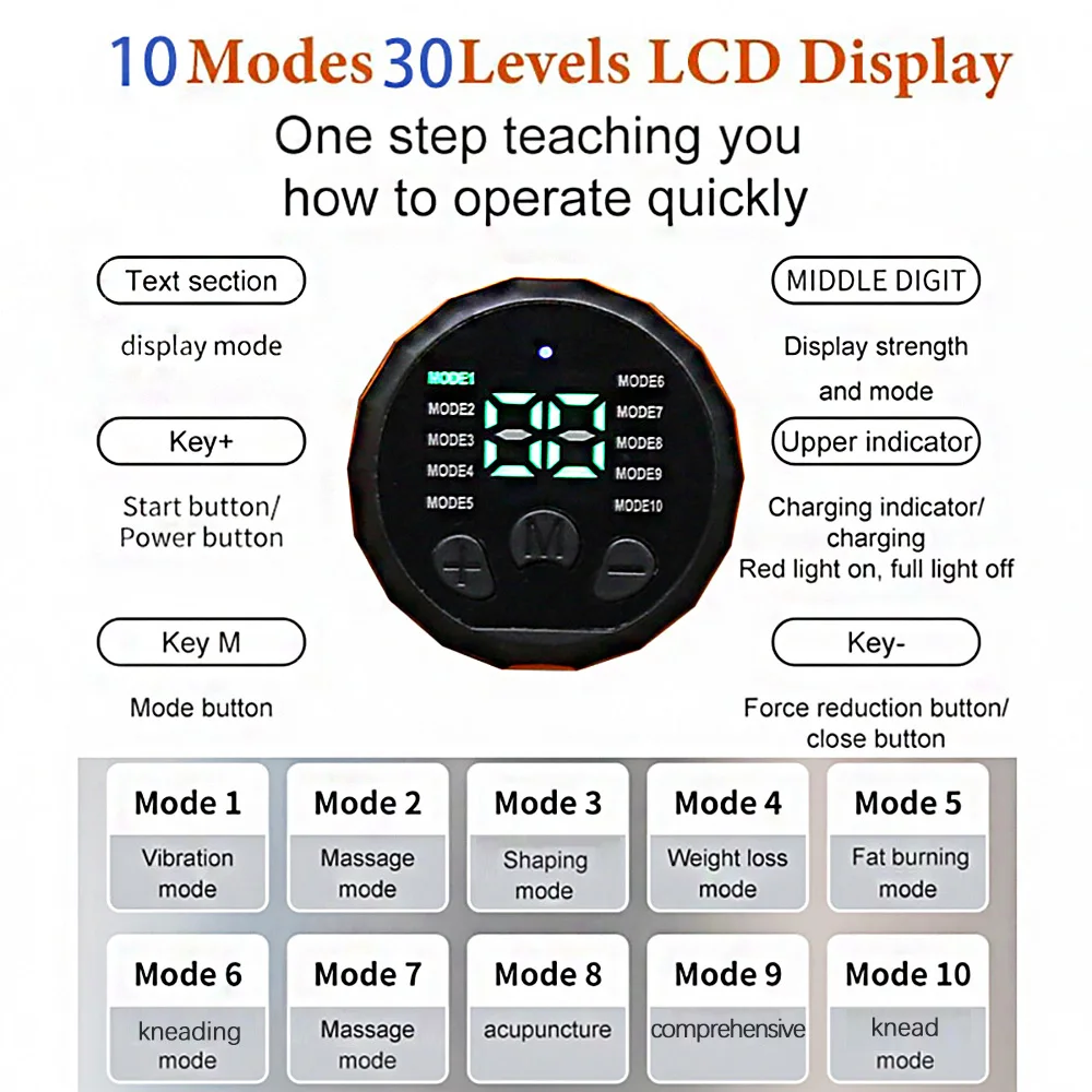 【Efficient Fat Burning, Fitness, and Shaping】: The muscle fitness stimulators have LED Display can clearly show 10 modes and 30 levels. You can control the mode and level by 3 buttons at machine to achieve the muscle training effect that you desire. A 15-minute training session with the EMS device is equivalent to 2000m jogging, 30 minutes of freestyle swimming, and 1 hours of yoga.